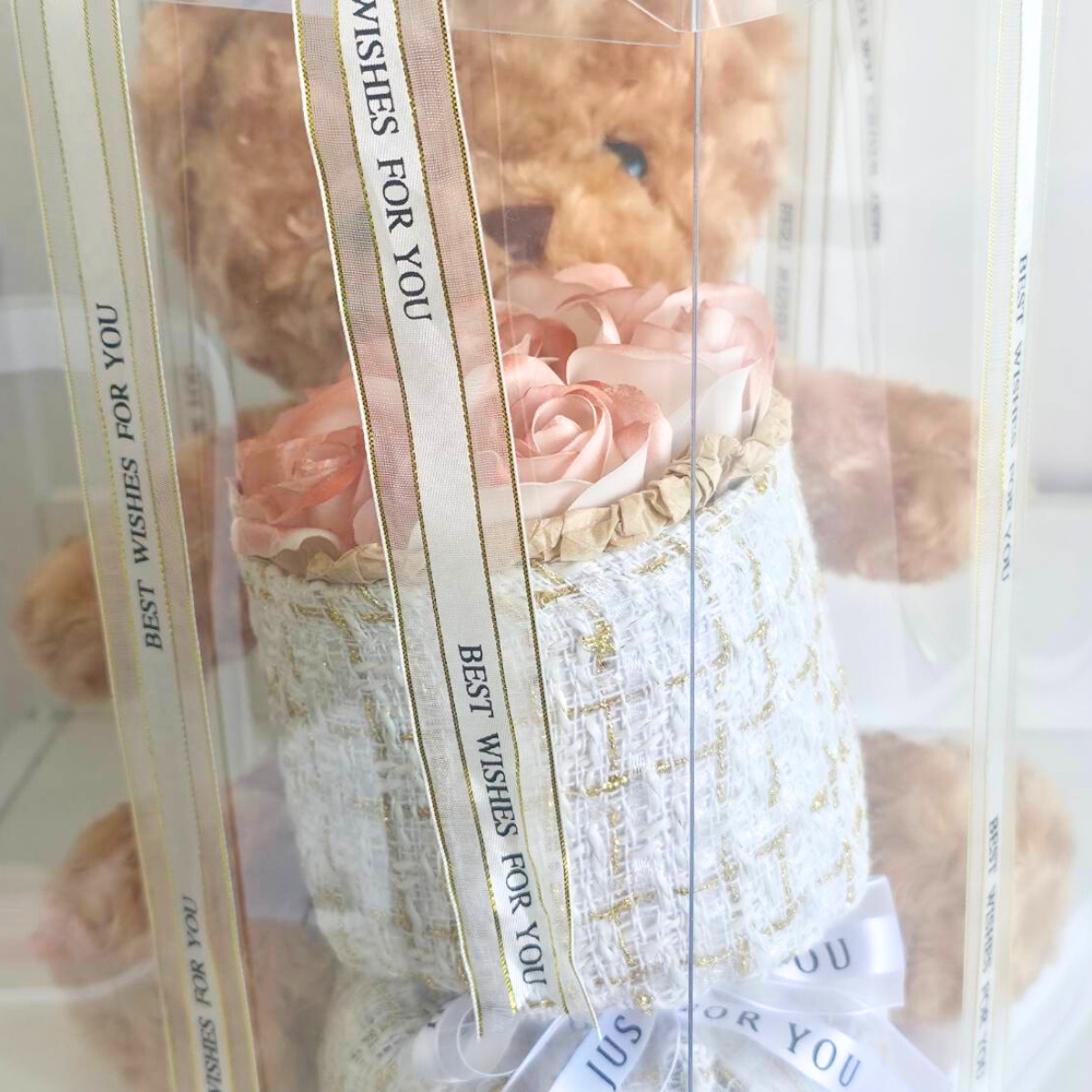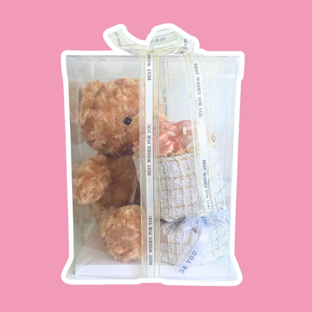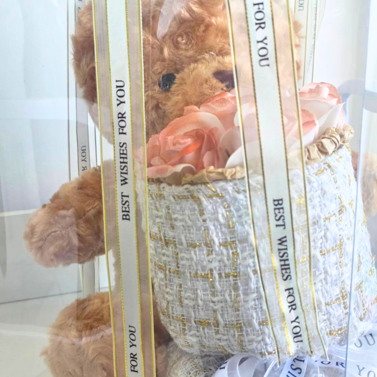 This premium gift set features a soft plush teddy bear paired with a decorative rose arrangement, carefully placed inside a clear display gift box and finished with elegant ribbon details. Designed to impress from the moment it arrives, this teddy gift box is ideal for romantic surprises, congratulatory gifts, or thoughtful gestures in Phuket.
